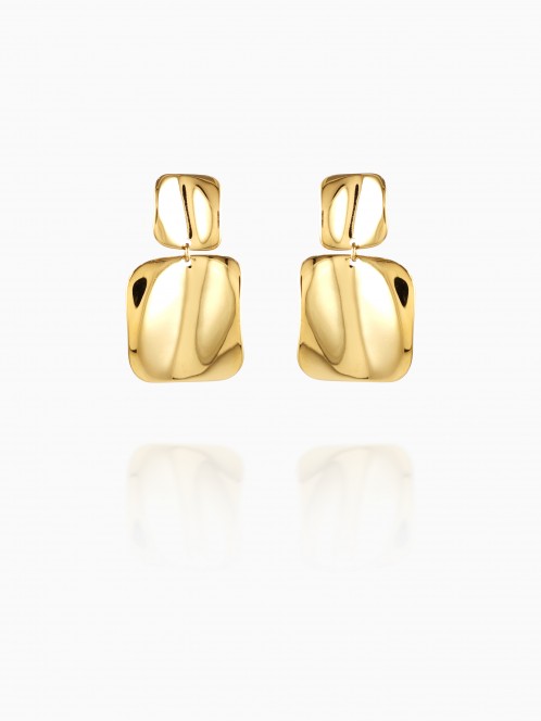 Deux rectangles dorés aux lignes nettes et au fini plissé s’alignent dans une silhouette graphique et sculpturale. Le relief subtil capte la lumière à chaque mouvement, apportant texture et modernité. Des boucles d’oreilles affirmées, pensées pour une allure contemporaine et élégante.