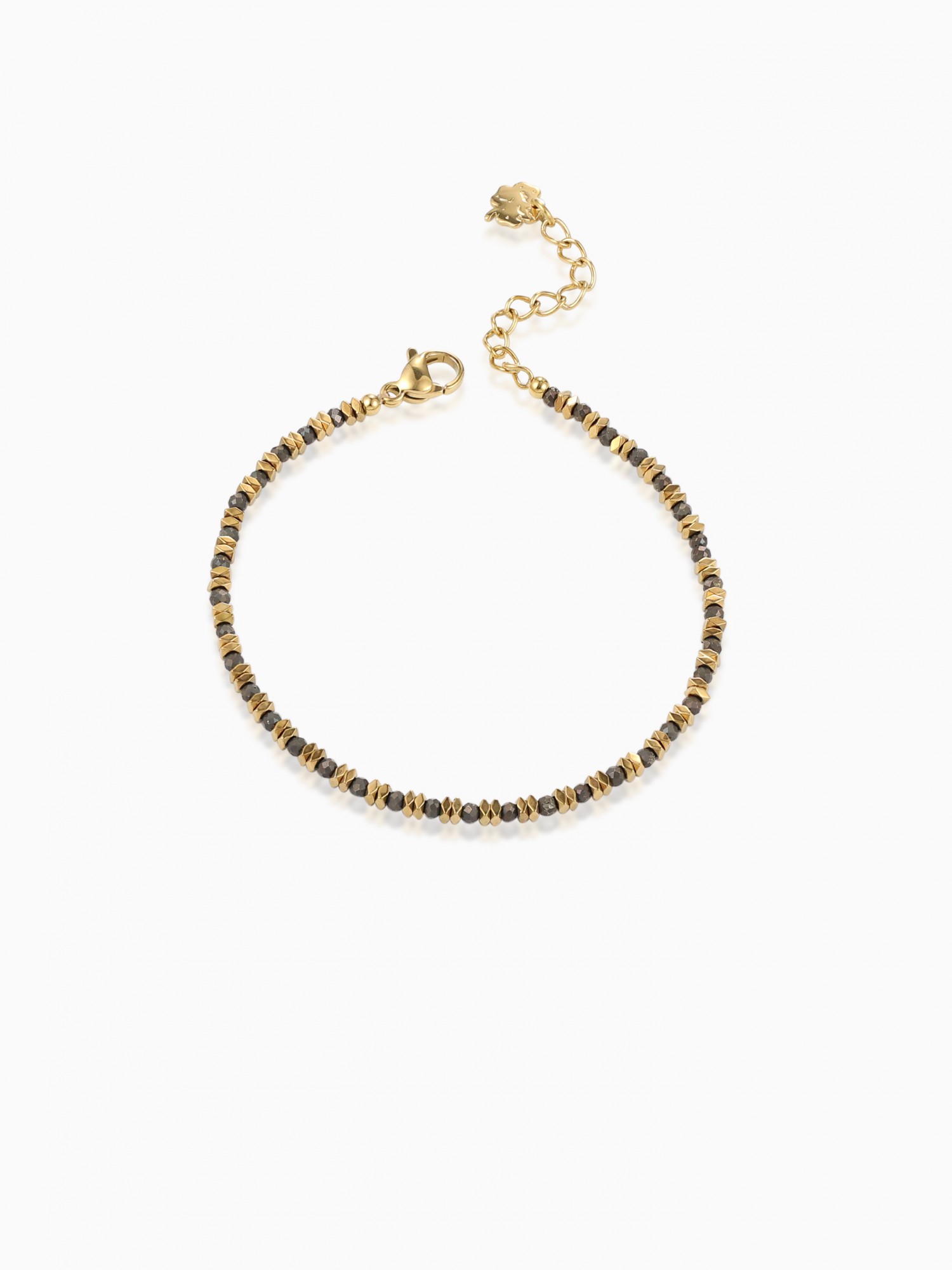 Un bracelet minimaliste tout en éclat, décliné en deux variantes précieuses. L’une mêle la douceur nacrée de la nacre naturelle à l’éclat doré des perles facettées, l’autre associe la brillance métallisée de la pyrite à la même élégance dorée. Deux compositions lumineuses, pensées pour sublimer les gestes du quotidien avec discrétion et raffinement.