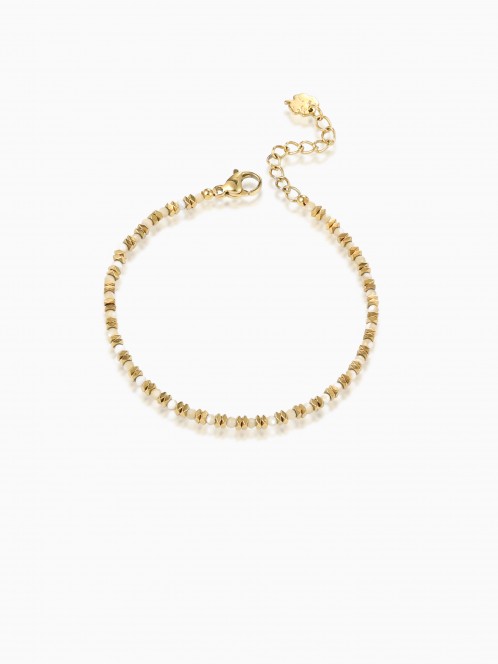 Un bracelet minimaliste tout en éclat, décliné en deux variantes précieuses. L’une mêle la douceur nacrée de la nacre naturelle à l’éclat doré des perles facettées, l’autre associe la brillance métallisée de la pyrite à la même élégance dorée. Deux compositions lumineuses, pensées pour sublimer les gestes du quotidien avec discrétion et raffinement.