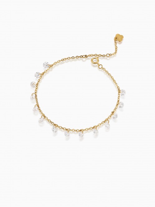 Ce bracelet fin en chaîne dorée est délicatement orné de petites pampilles transparentes à facettes, qui captent la lumière à chaque mouvement. Léger et scintillant, il évoque une pluie d’éclats cristallins autour du poignet. Un bijou aérien et élégant, parfait pour sublimer vos gestes avec discrétion.