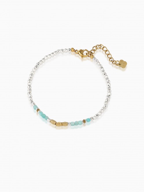 Le bracelet Nymira marie des perles facettées argentées à une rangée centrale de perles amazonite bleu-vert et d’éléments dorés finement texturés. L’harmonie entre les nuances froides et les touches chaudes crée une pièce lumineuse, délicate et contemporaine — parfaite pour illuminer le poignet avec subtilité.