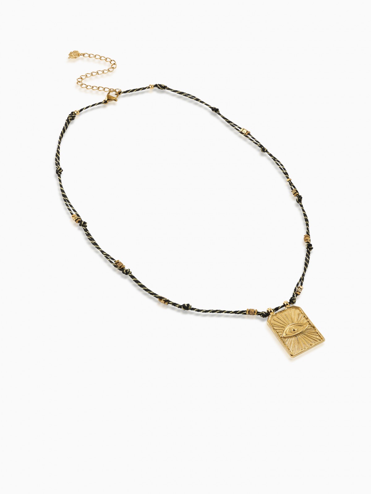 Collier monté sur un cordon torsadé noir et crème, orné de petites perles dorées nouées à intervalles réguliers. Le pendentif doré en forme de rectangle irrégulier est gravé d’un œil central entouré de rayons abstraits, évoquant à la fois le mystère et la lumière.