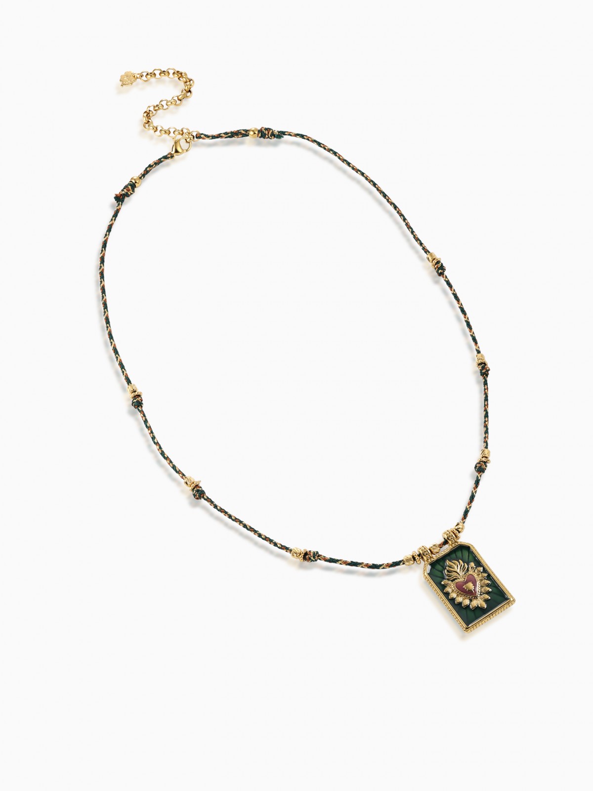 Collier fin composé d’un cordon tressé multicolore, orné au centre d’une perle dorée en forme d’amulette texturée, sertie de pierres colorées. L’une d’elles, de forme ronde et vert émeraude, est mise en valeur au centre. Fermoir mousqueton avec chaîne d’extension dorée et médaille signature gravée.