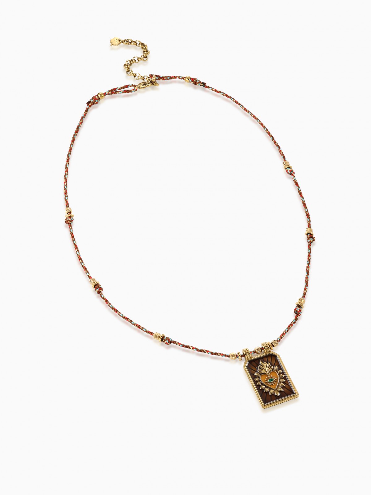 Collier fin composé d’un cordon tressé multicolore, orné au centre d’une perle dorée en forme d’amulette texturée, sertie de pierres colorées. L’une d’elles, de forme ronde et vert émeraude, est mise en valeur au centre. Fermoir mousqueton avec chaîne d’extension dorée et médaille signature gravée.