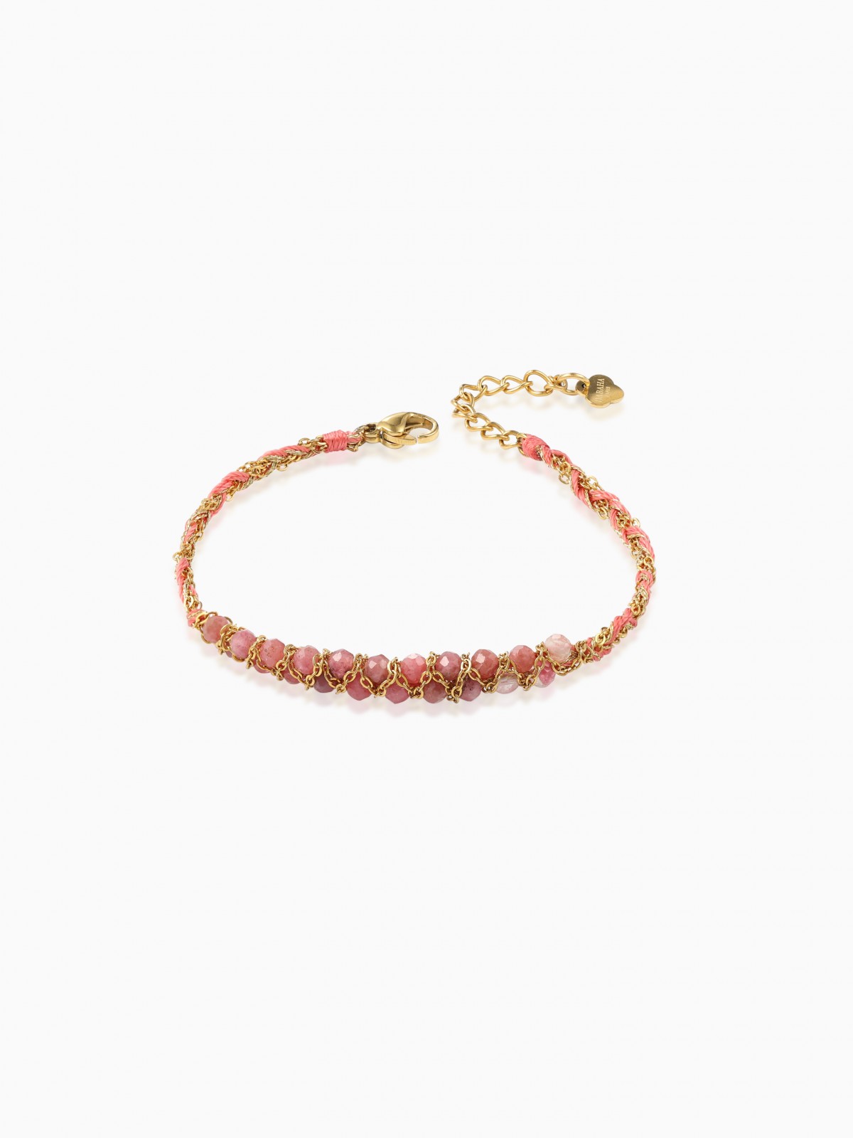 Matière : Acier doré, Fil tressé, Chaine en laiton, Pierre semi-précieuse, Tourmaline rose