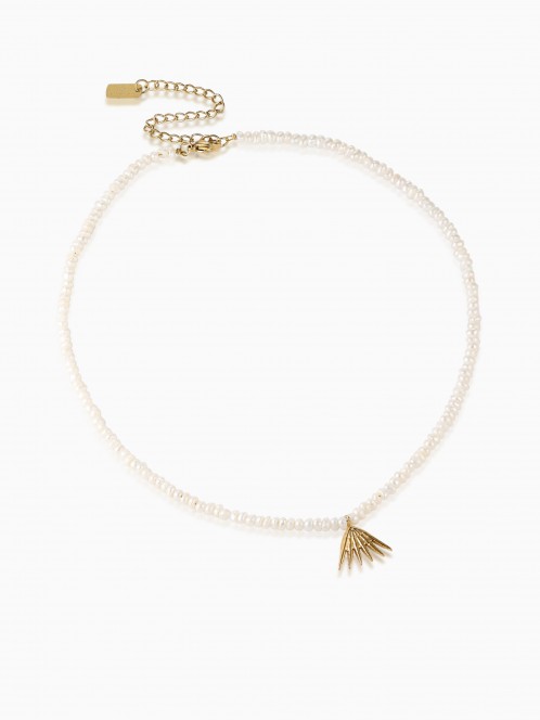 Ce collier est composé de perles d’eau douce délicatement espacées, offrant un éclat doux et organique. Il est rehaussé d’un pendentif doré aux lignes épurées, qui apporte une touche de contraste élégant à l’ensemble. Une pièce féminine, intemporelle et raffinée.