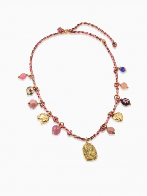 Le collier Yséline est composé d’un cordon tressé délicat orné de multiples pampilles colorées et de pierres décoratives qui apportent relief et fantaisie. Son pendentif central doré inspiré de l’Égypte ancienne attire le regard et donne à ce bijou une touche bohème et originale.