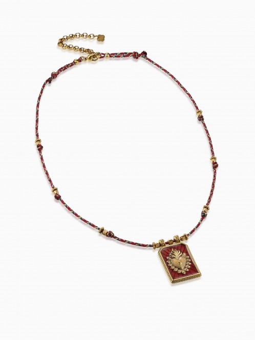Ce collier est composé d’un cordon tressé délicat orné de perles dorées et d’un pendentif rectangulaire décoré d’un cœur sacré en relief. Son médaillon lumineux et son style bohème apportent une touche symbolique et élégante à votre tenue.