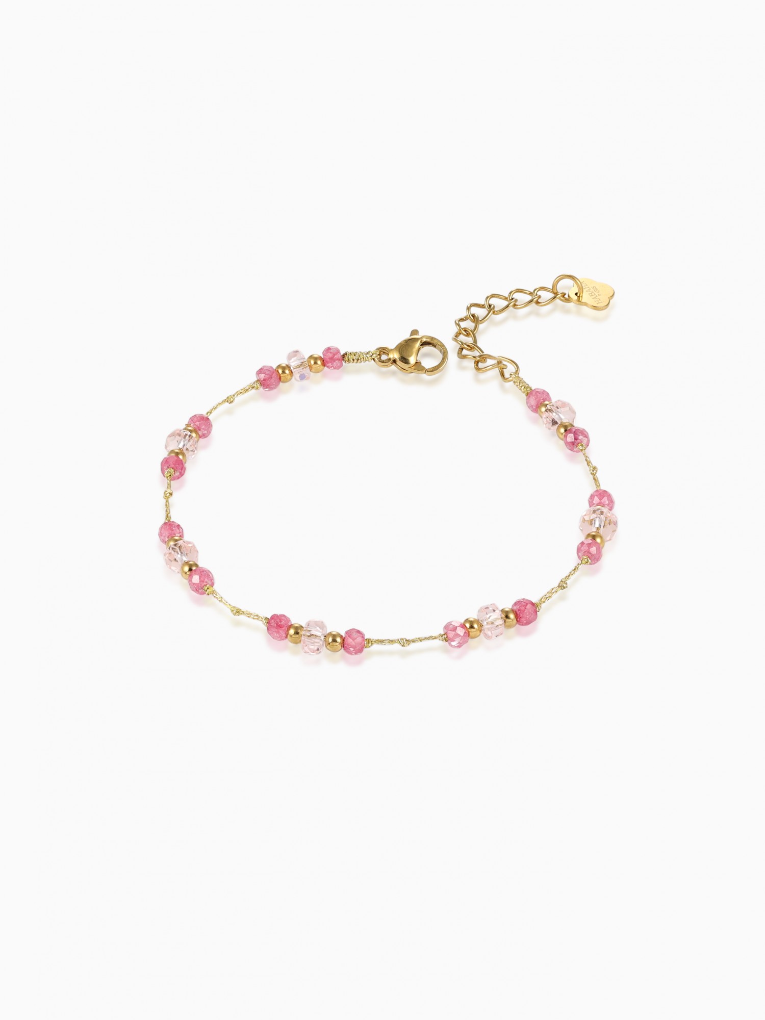 A breath of mineral tenderness. This bracelet, strung on an elastic cord, combines the softness of rose quartz with the delicate transparency of glass beads. Its powdery hues subtly capture the light, evoking a soothing and luminous femininity. A piece of jewelry of pure simplicity, perfect for highlighting natural grace.