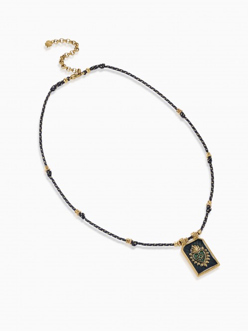 A delicate necklace composed of a multicolored braided cord, adorned in the center with a textured gold amulet-shaped bead set with colored stones. One of these stones, round and emerald green, is highlighted at the center. It fastens with a lobster clasp, a gold extension chain, and an engraved signature charm.