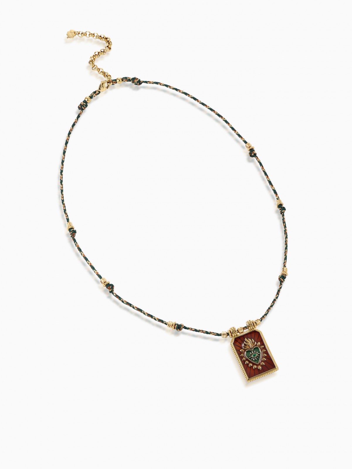 A delicate necklace composed of a multicolored braided cord (anise, cream, and lilac), adorned in the center with a textured gold amulet-shaped bead set with colored stones. One of these stones, round and emerald green, is highlighted at the center. It fastens with a lobster clasp, a gold extension chain, and an engraved signature charm.