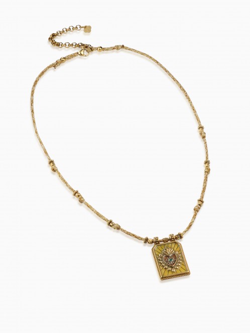 A delicate necklace composed of a multicolored braided cord (anise, cream, and lilac), adorned in the center with a textured gold amulet-shaped bead set with colored stones. One of these stones, round and emerald green, is highlighted at the center. It fastens with a lobster clasp, a gold extension chain, and an engraved signature charm.