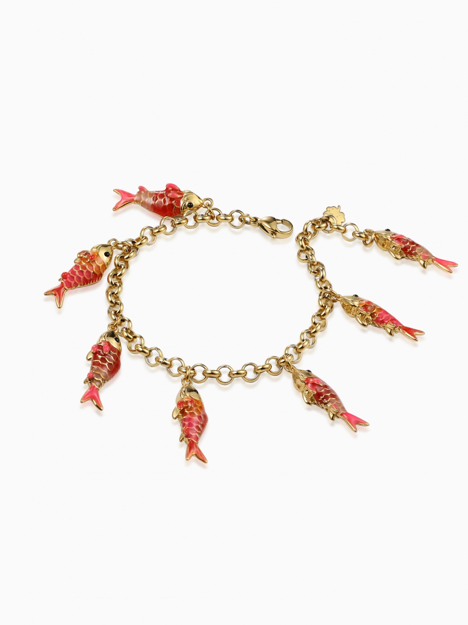 The Calythé bracelet evokes the spirit of the sea with its gold chain adorned with charming enameled fish. Its colorful pendants bring movement and light to the wrist. A summery and elegant piece of jewelry reminiscent of the sun-drenched shores of the Mediterranean.